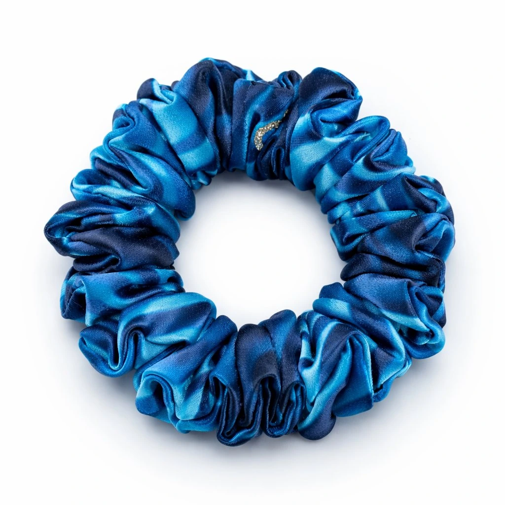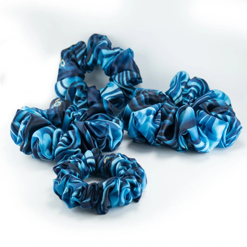 Modrá vládkyně vln. Nejmenší z nich. Skvělá na sport, nebo na méně husté vlasy. Lehká gumička z umělého hedvábí. Pevně drží i na jemných vlasech. Materiál je příjemný a lehký. S jemným leskem. Nemotá se do vlasů a nepřelamuje je jako tenké gumičky. O trochu méně klouzavý materiál než satén. Je šetrnou alternativou pro váš účes.