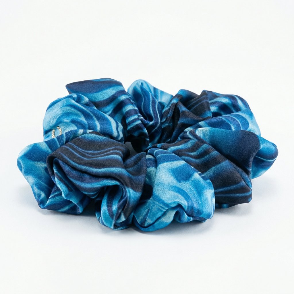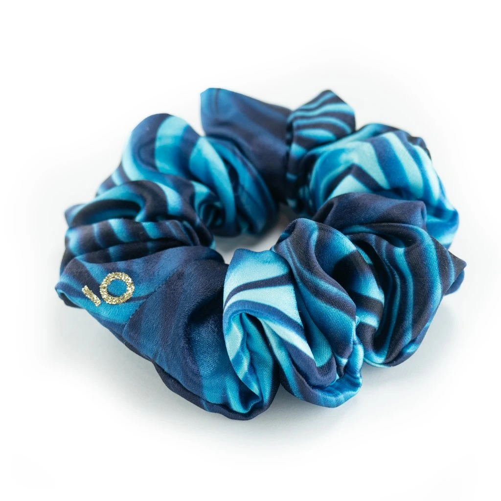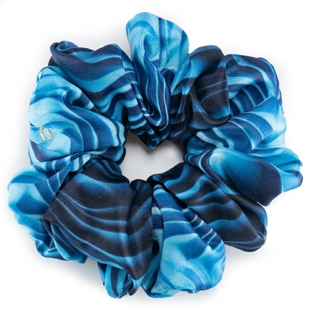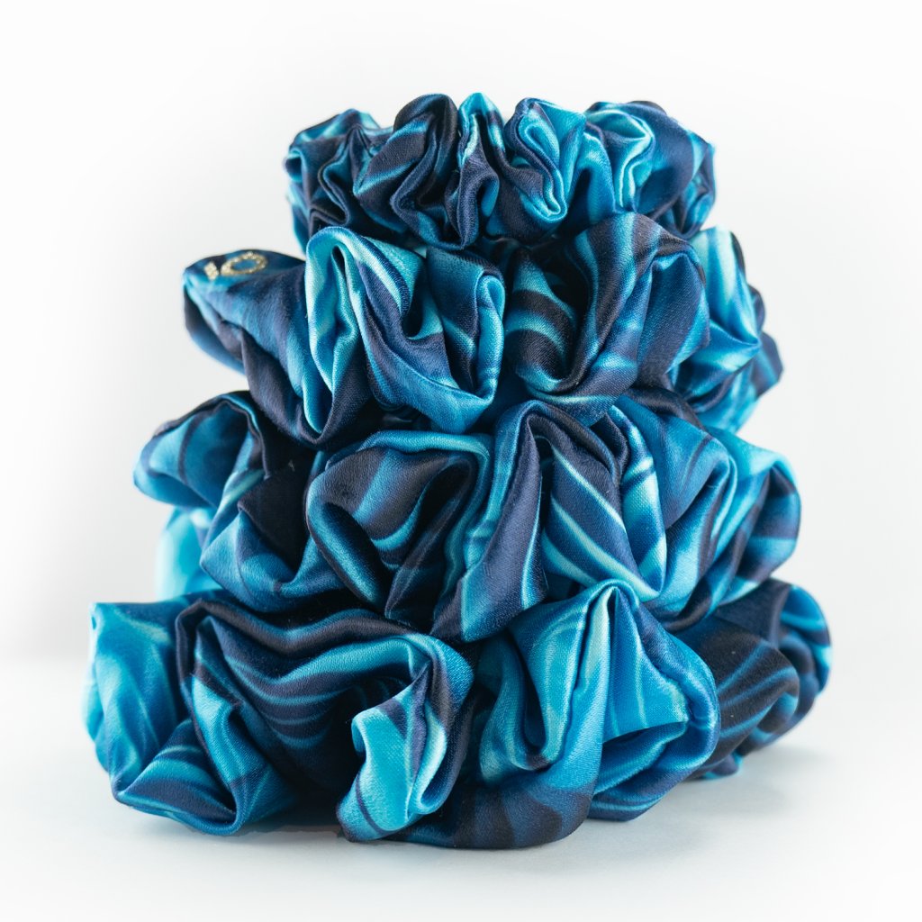 Modrá vládkyně vln. Lehká gumička z umělého hevábí. Pevně drží i na jemných vlasech. Materiál je příjemný a lehký. S jemným leskem. Nemotá se do vlasů a nepřelamuje je jako tenké gumičky. O trochu méně klouzavý materiál než satén. Je šetrnou alternativou pro váš účes.