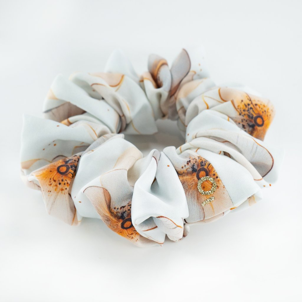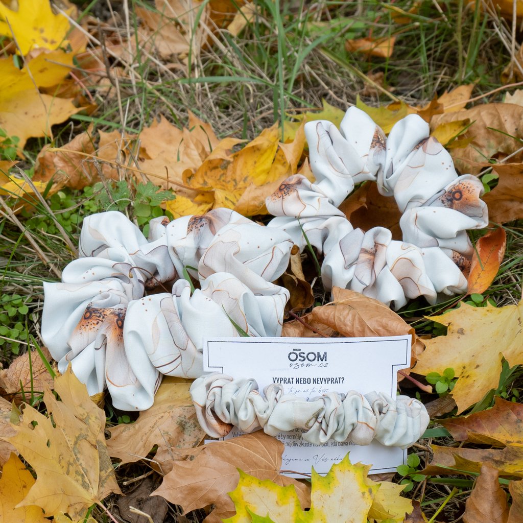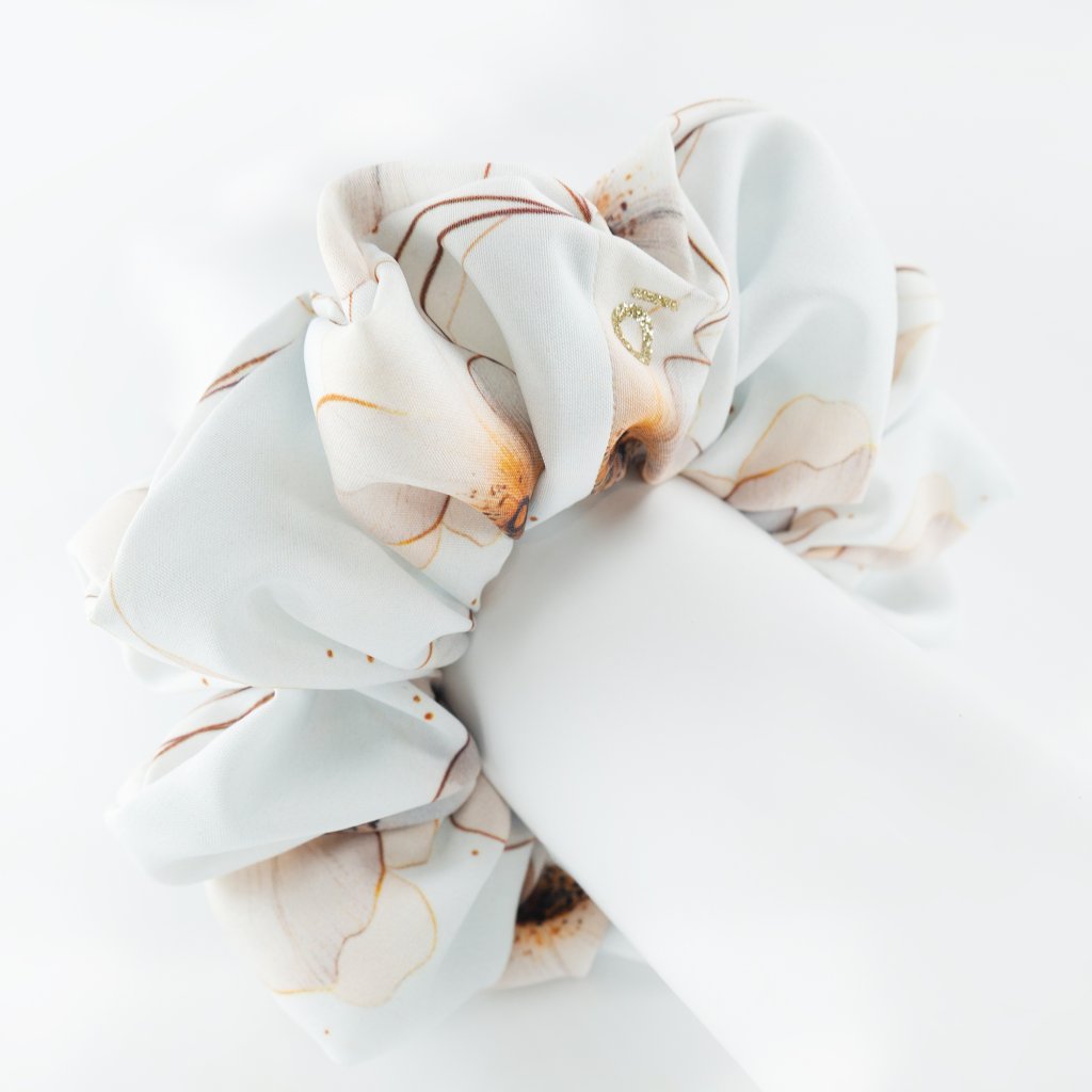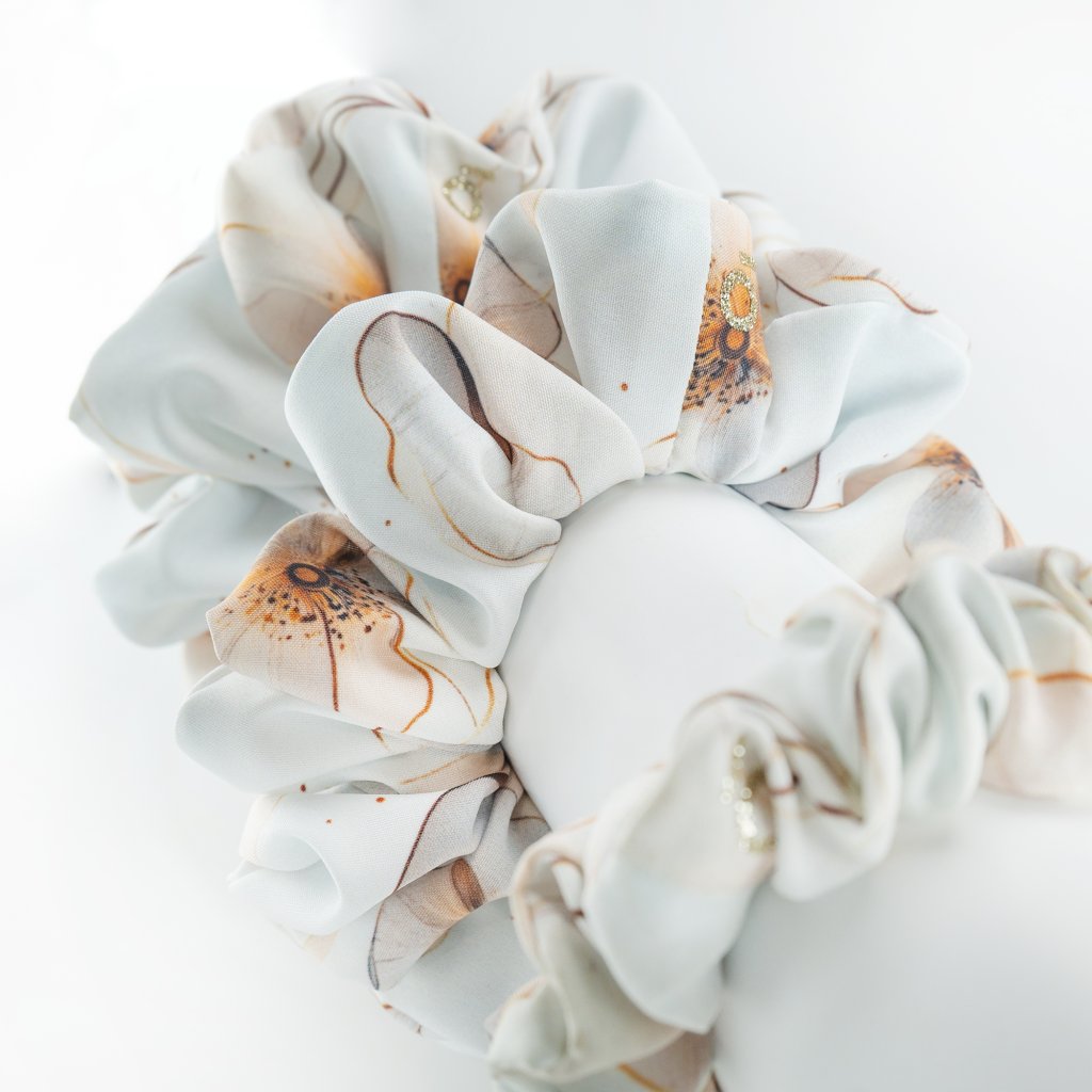 Bílozlaté květy. Lehká hedvábná gumička. Pevně drží i na jemných vlasech, vhodná pro každého, kdo nemá rád zátěž ve vlasech. Materiál je příjemný a téměř nic neváží přesto je nadýchaná. Má matný vzhled - méně extravagantní. Nemotá se do vlasů a nepřelamuje je jako tenké gumičky. Je šetrnou alternativou pro váš účes.