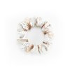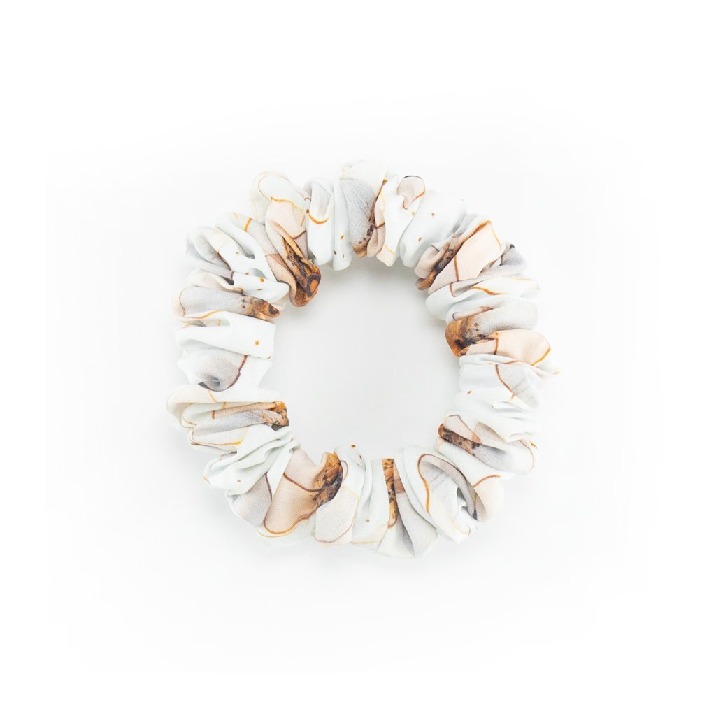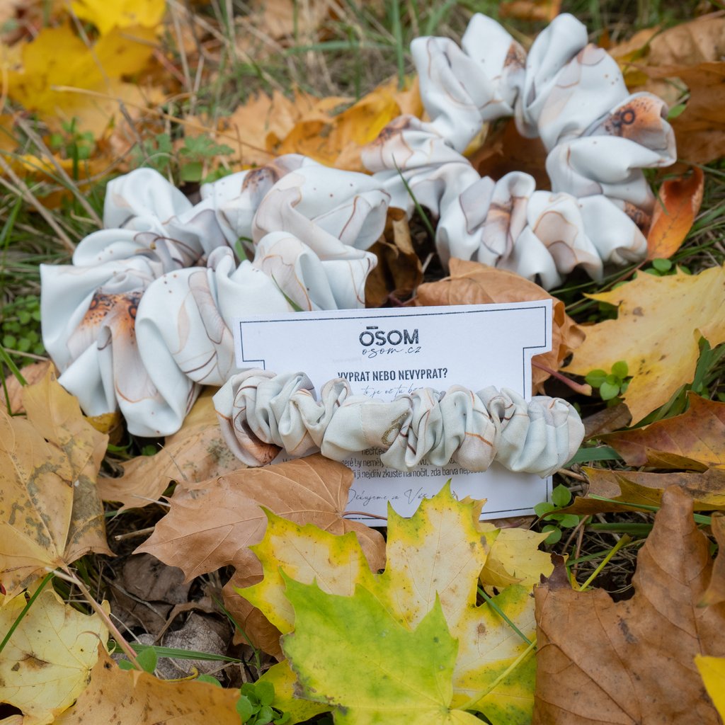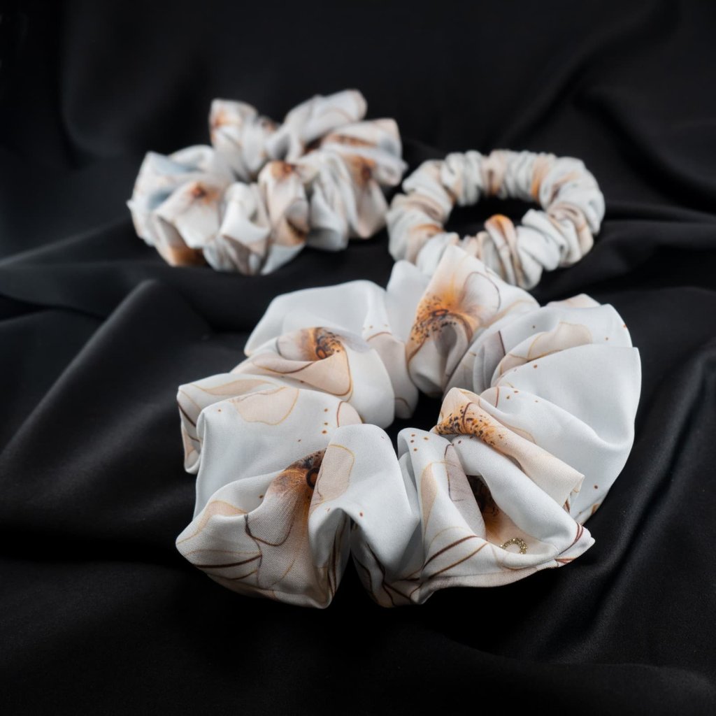 Bílozlaté květy. Lehká hedvábná gumička. Pevně drží i na jemných vlasech, vhodná pro každého, kdo nemá rád zátěž ve vlasech. Materiál je příjemný a téměř nic neváží přesto je nadýchaná. Má matný vzhled - méně extravagantní. Nemotá se do vlasů a nepřelamuje je jako tenké gumičky. Je šetrnou alternativou pro váš účes.