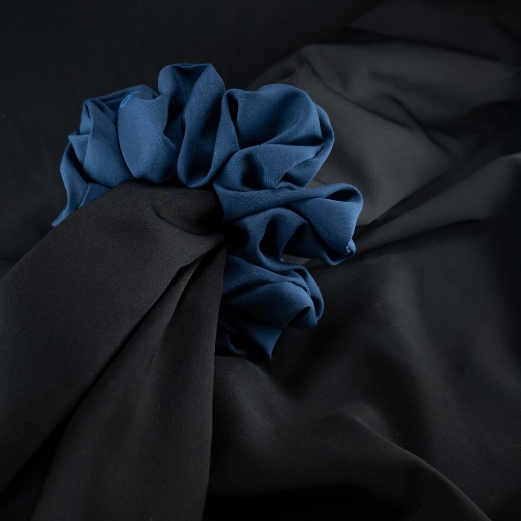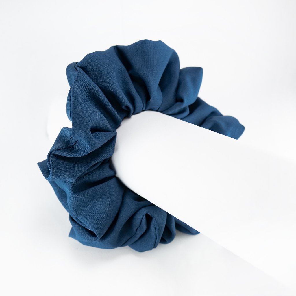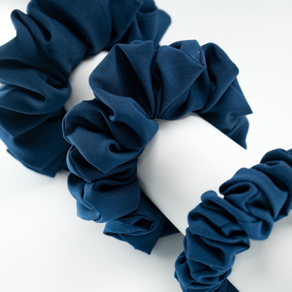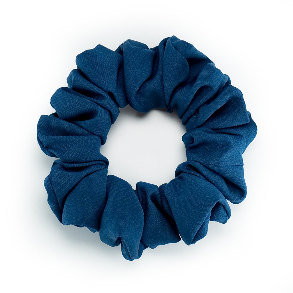 Námořnická. Jednoduchá, elegantní. Modre květy. Lehká hedvábná gumička. Pevně drží i na jemných vlasech, vhodná pro každého, kdo nemá rád zátěž ve vlasech. Materiál je příjemný a téměř nic neváží přesto je nadýchaná. Má matný vzhled - méně extravagantní. Nemotá se do vlasů a nepřelamuje je jako tenké gumičky. Je šetrnou alternativou pro váš účes.