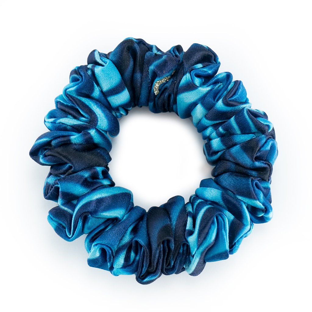 Námořnická. Jednoduchá, elegantní. Modre květy. Lehká hedvábná gumička. Pevně drží i na jemných vlasech, vhodná pro každého, kdo nemá rád zátěž ve vlasech. Materiál je příjemný a lehký. S jemným leskem. Nemotá se do vlasů a nepřelamuje je jako tenké gumičky. Je šetrnou alternativou pro váš účes.